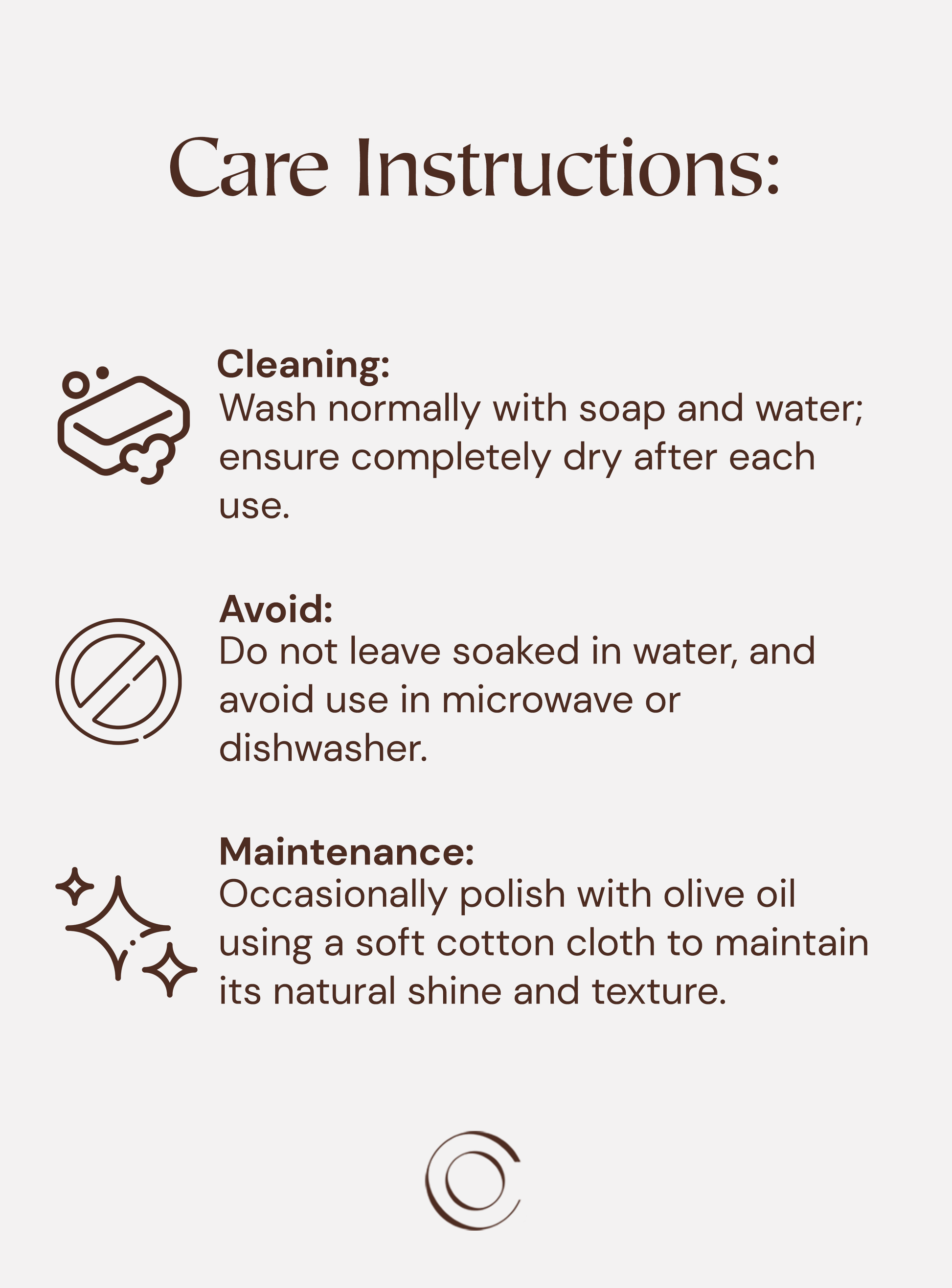 Поддръжка : От време на време полирайте със зехтин, като използвате мека памучна кърпа, за да запазите естествения блясък и текстура.