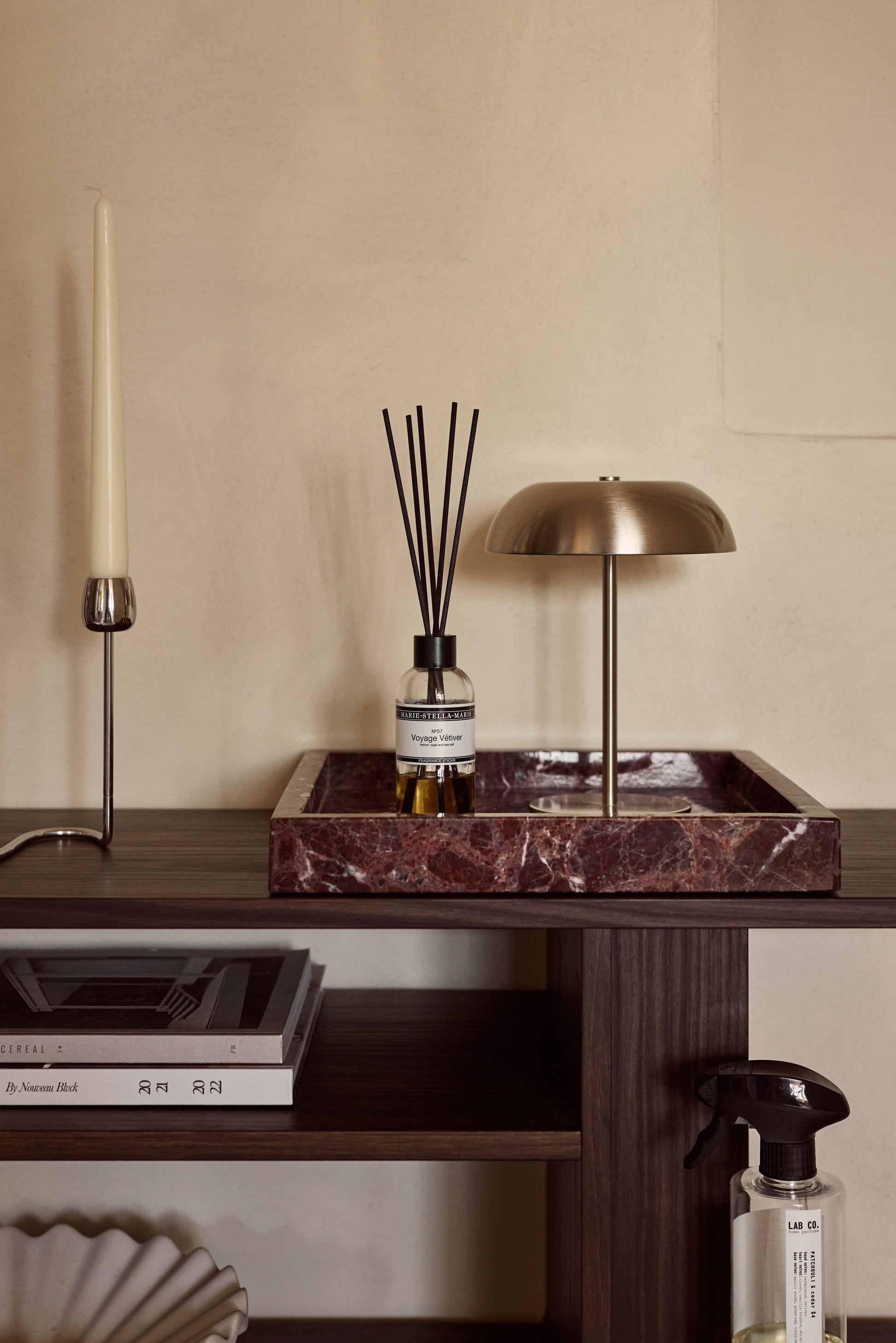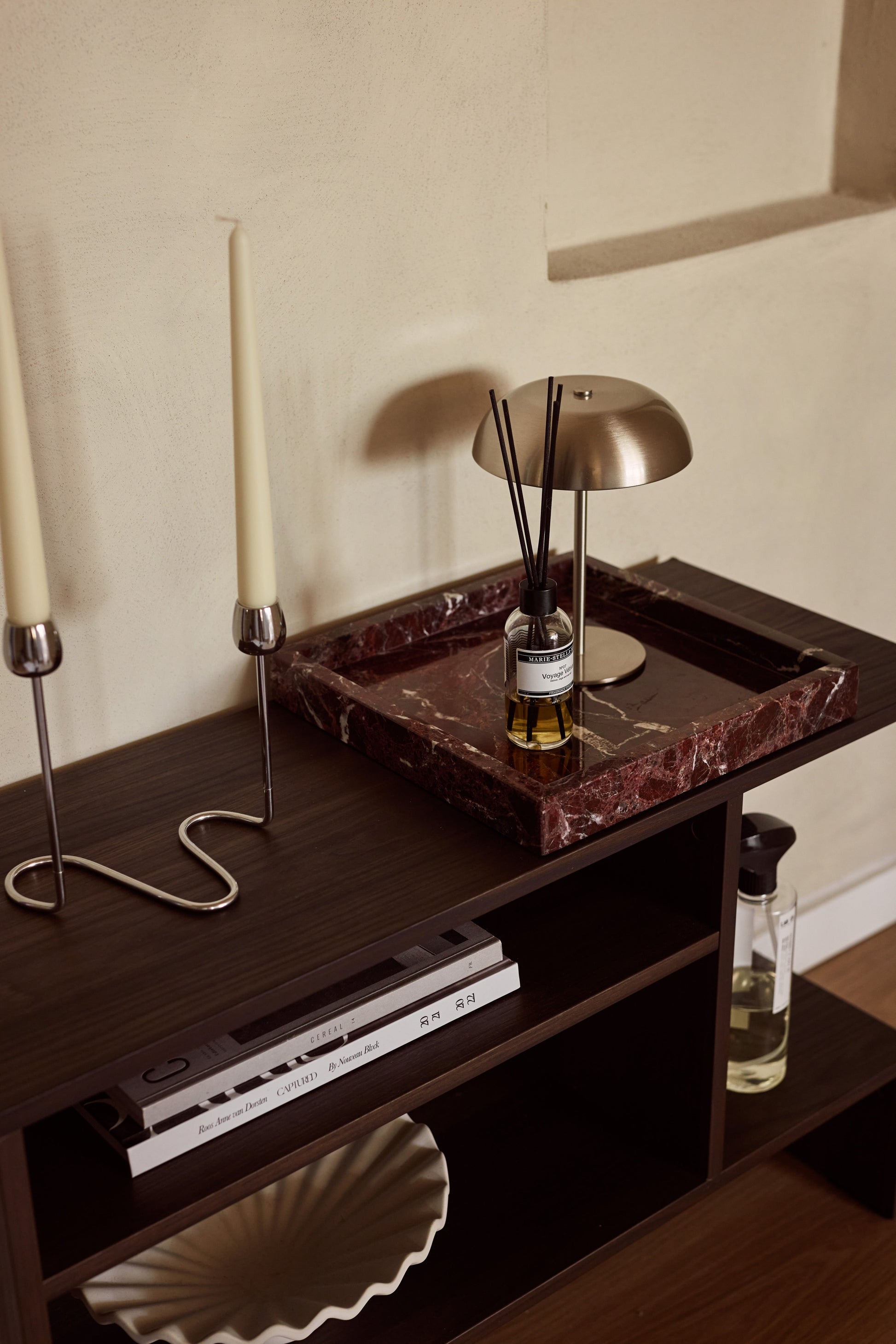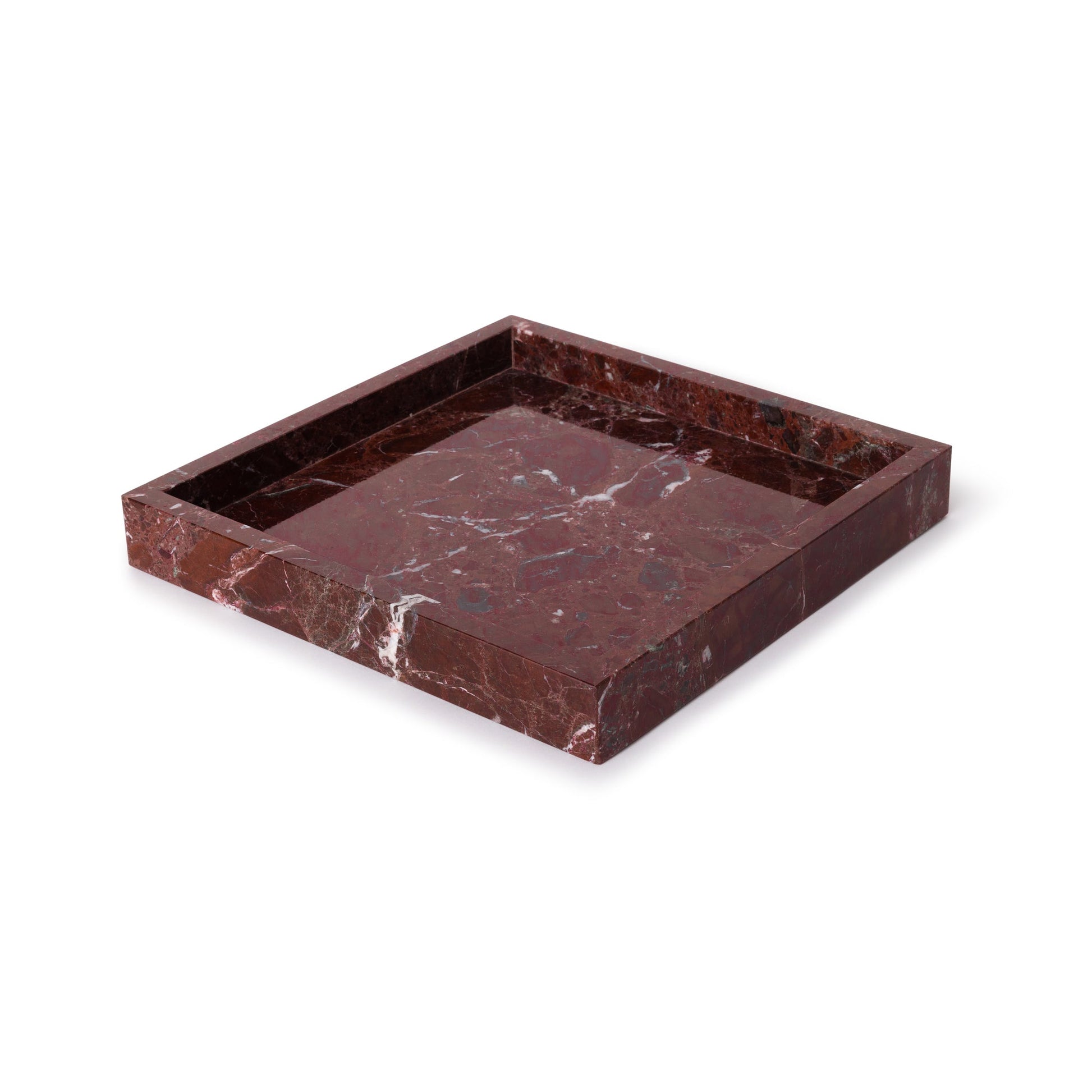 Квадратен поднос от червен мрамор Rojo Alicante, който привлича вниманието. Изрязан от естествена каменна плоча с повдигнати ръбове. Идеален за масичка за кафе, табуретка или трапезна маса. Всяко парче е уникално.