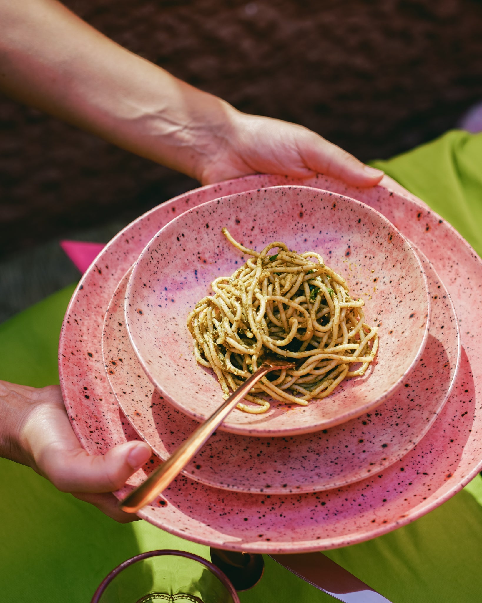 Ръчно изработена керамична дълбока чиния от колекцията Rosalía, идеална за супи, салати или паста. Нежната розова глазура с естествени петънца създава органичен, занаятчийски облик. Всяка чиния е изработена и глазирана на ръка в Испания, което я прави уникално несъвършена.