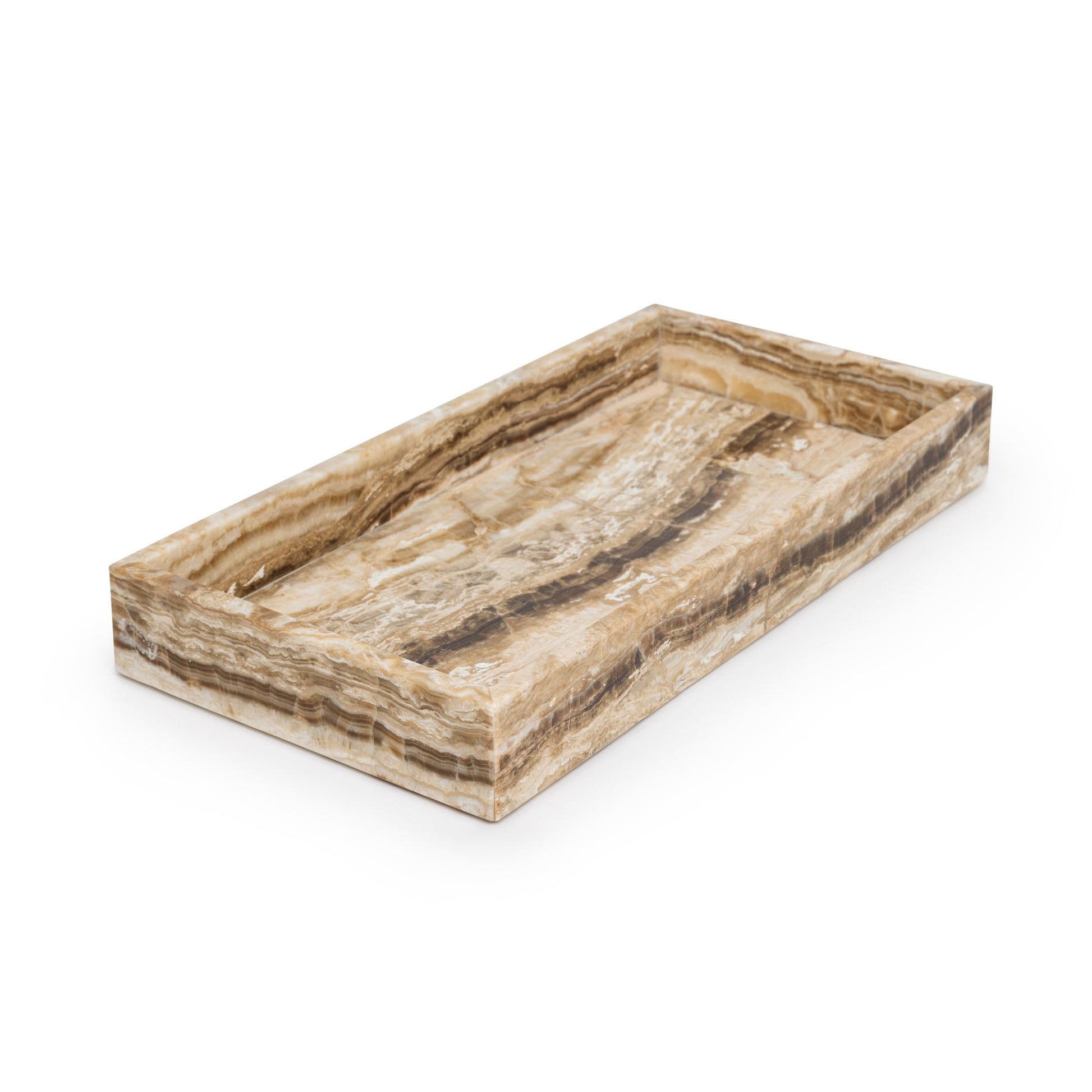Голям поднос от мрамор Sandal Onyx с повдигнати ръбове. Изрязан от естествена каменна плоча и полиран до гладкост. Бордът предпазва предметите - идеален за свещи, бутилки или декорация. Всяко парче е уникално.