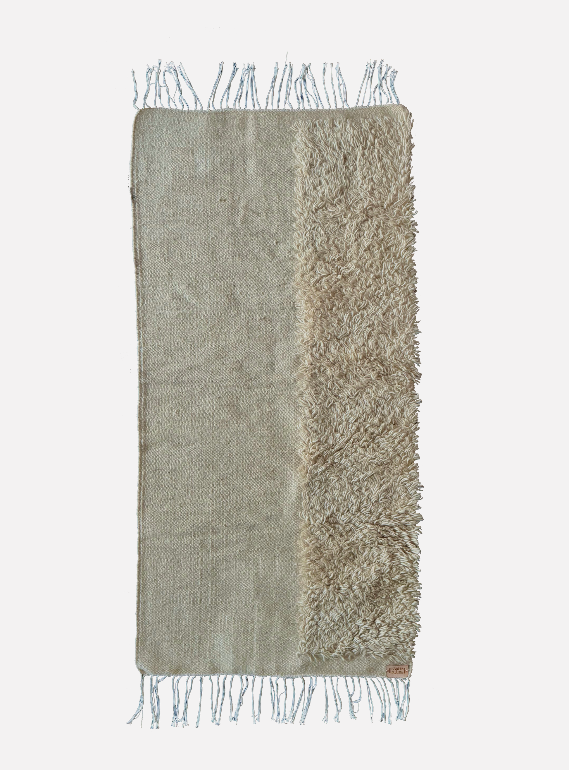Atribute unice: Prezintă o dungă texturată de lână pe o bază plată țesută, inspirată de dunele naturale de nisip, cu margini franjurate pentru un finisaj elegant. Fiecare piesă este realizată manual și este unică.